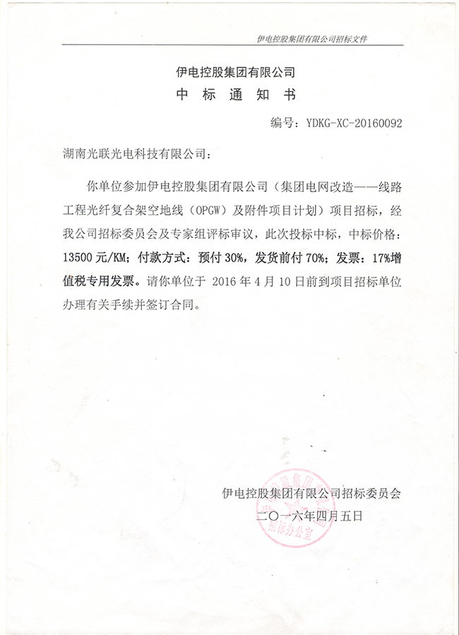 伊電控股集團電網(wǎng)改造OPGW光纜中標(biāo)通知書