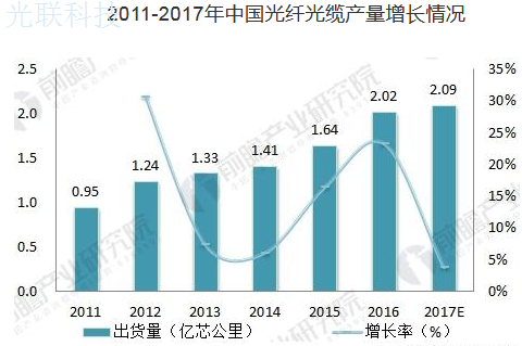 據(jù)前瞻產(chǎn)業(yè)研究院發(fā)布的《中國光纖光纜行業(yè)發(fā)展前景與投資預測分析報告》數(shù)據(jù)顯示,2011年以來,我國光纖光纜產(chǎn)量呈現(xiàn)逐年增長的趨勢。2011-2016年,中國光纖光纜行業(yè)產(chǎn)量從0.95億芯公里上升至2.02億芯公里,年均增長率高達16.7%。