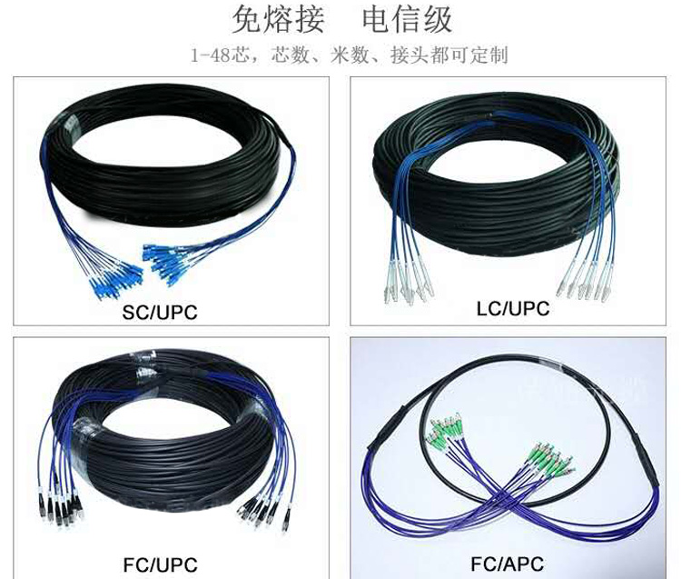 預制光纜:經(jīng)過工廠預處理后,在光纜的一端或者兩端根據(jù)需要連接各種類型的光纖連接器,可實現(xiàn)預制端在施工現(xiàn)場的無熔接接續(xù)點的連接或直連光纜。